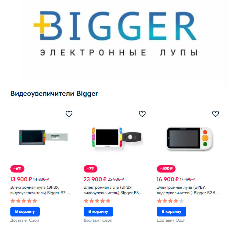 Компания Bigger предлагает приобрести портативные видеоувеличители средствами электронного сертификата СФР. Ознакомиться с каталогом продукции и оформить заказ на цифровые лупы можно на нашем сайте. Выбирайте наиболее подходящие для себя технические средства реабилитации на удобных вам интернет-площадках. Оперативность доставки и высокое качество продукции – гарантировано!
